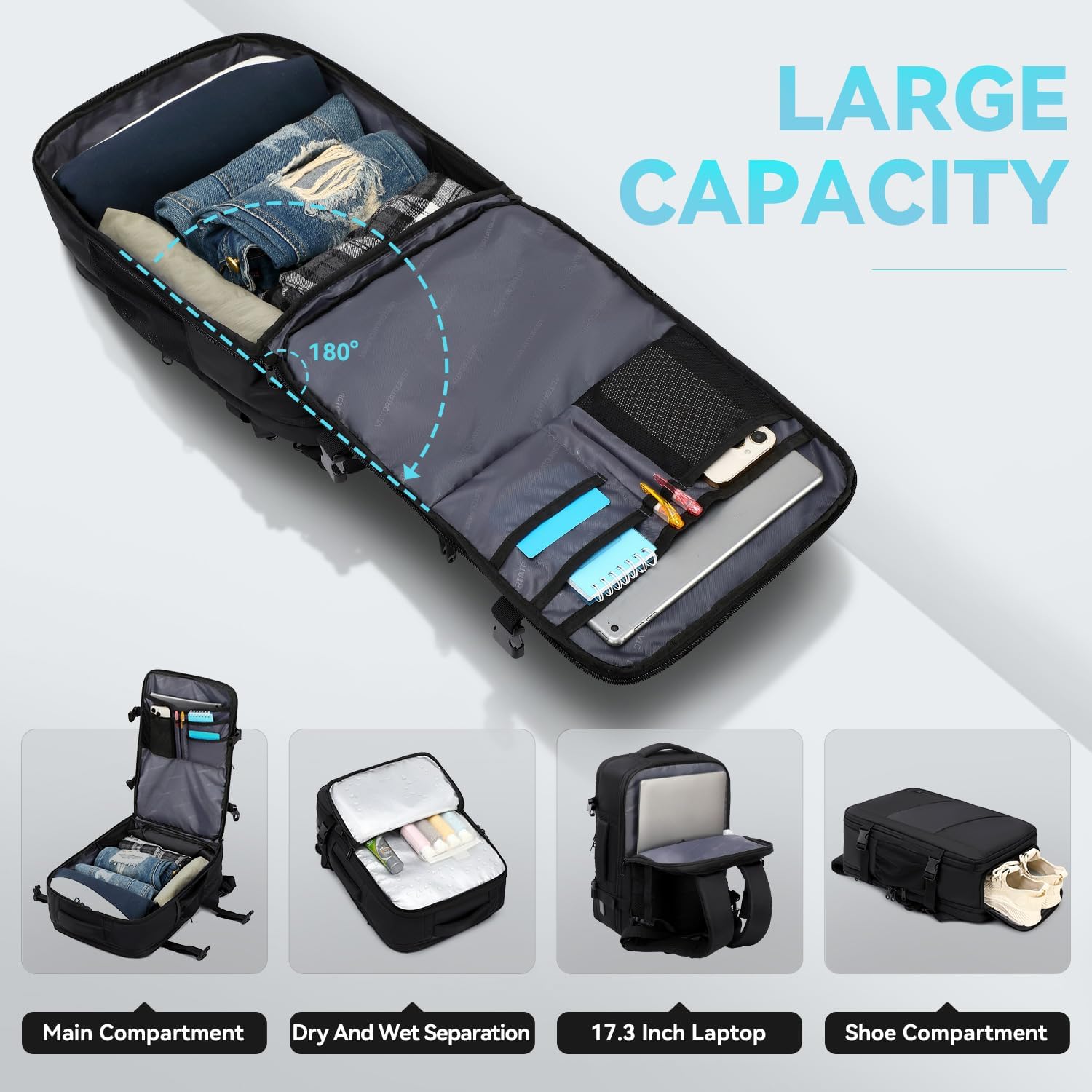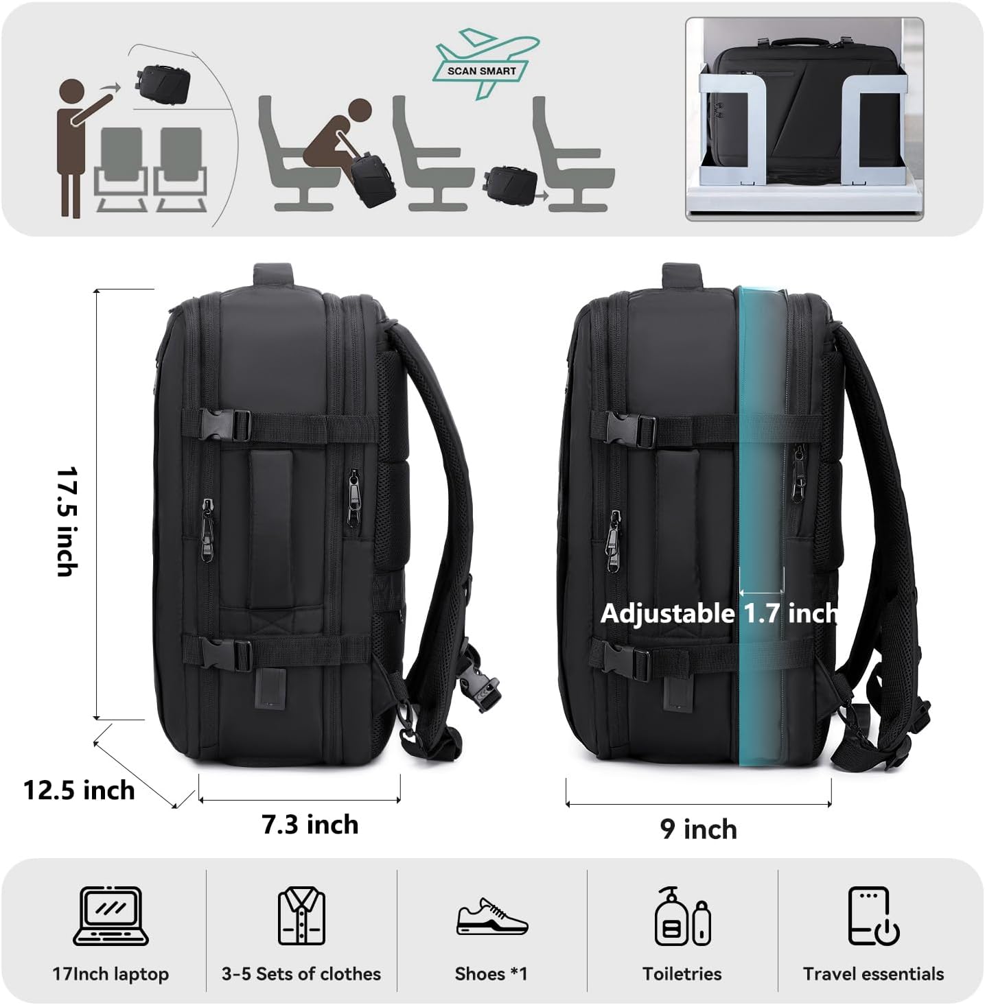 【Expandable & Large Capacity】:This extra large travel backpack with expandable feature offers you more packing capacity up to 40L.Unzipping to get larger storage space then can easily hold packing cubes, make-up bag, outfits, camera bag and gear for 3~7 days of travel. The carry on backpack fits overhead and under seat while on state of standard carry on size, is ideal for men, women, weekend traveler, or occasional vacationer.