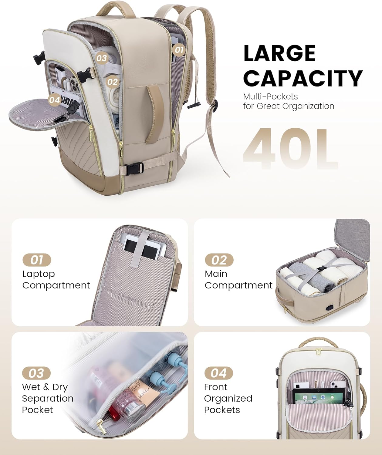 【Large Capacity & Well Organized】40L capacity, 4 main compartments, and 15 pockets, designed to allow you to easily separate and organize your travel personal items, roomy space can even fit in 3-7 days of travel essentials.