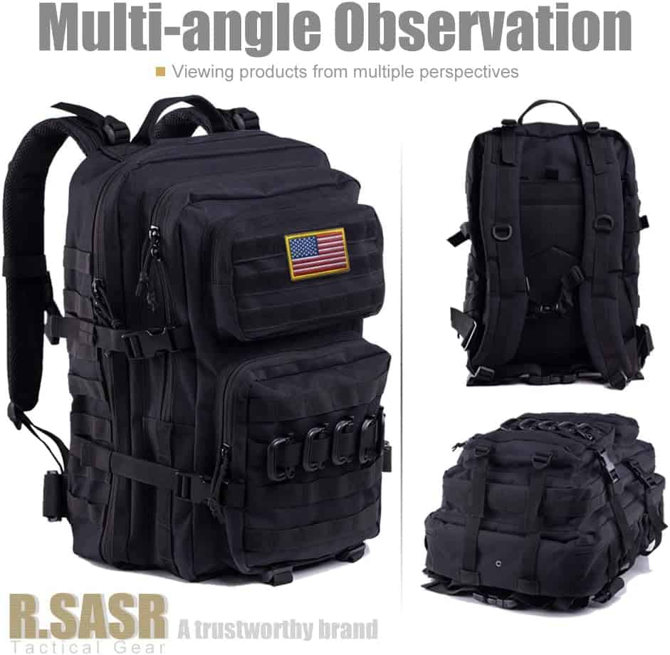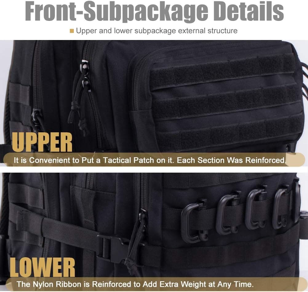 Military backpack is Made of 600×600 Density fabric,Tactical Backpack is Reinforced and Double Stitched at All Stress Points. There are 2 main compartments, 2 small compartments in front, and a back compartment for a hydration bladder (backpack didn’t include hydration bladder). Each of the compartments has variety pockets to help with organization.