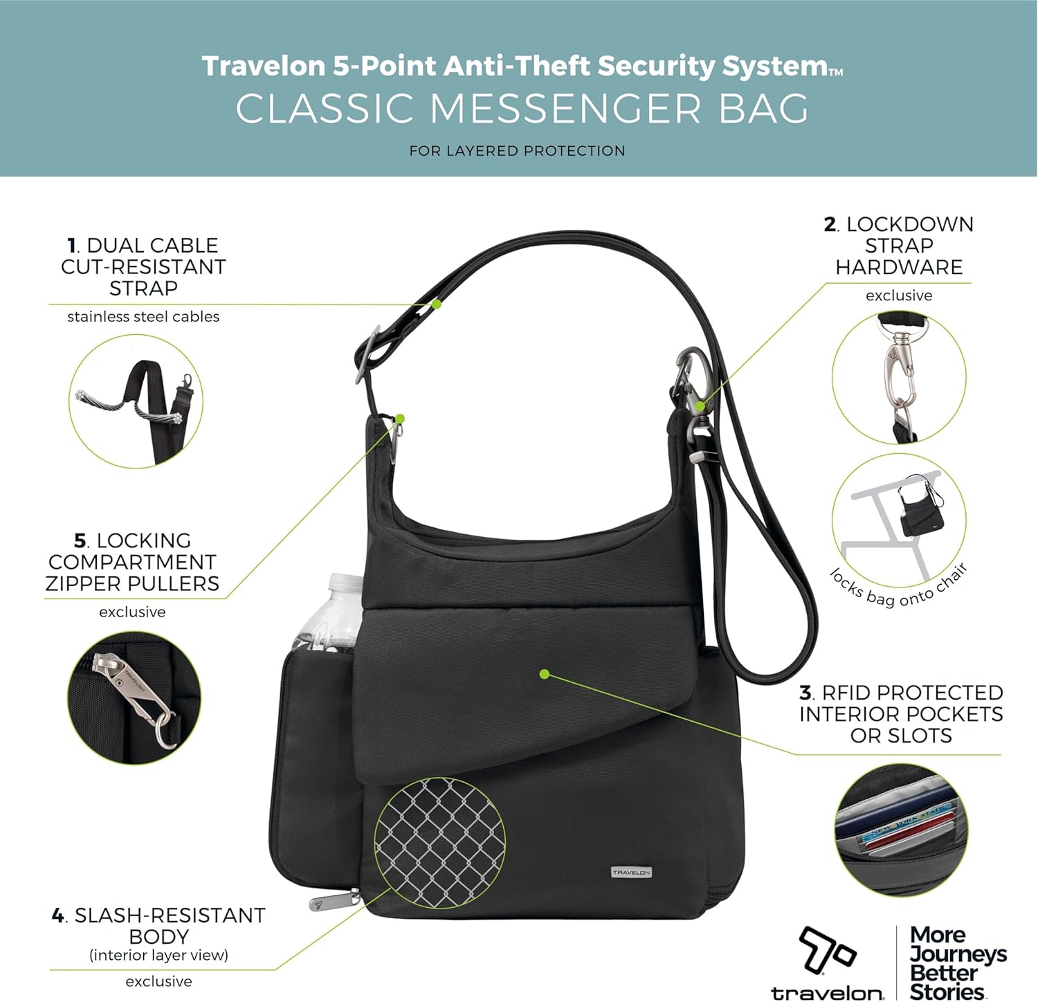 Protect your belongings from pickpockets and slash-and-grab thieves with the Anti-theft Travel Bag from Travelon. Featuring hidden, slash-proof, Chain Link construction and an adjustable, cable-reinforced, cut-proof shoulder strap. The roomy main compartment features a locking zipper and pockets for organization. The rear organizer includes slots for credit cards, and pockets for travel documents. The zippered expansion pocket holds a camera, water bottle, or sunglasses. For more than 35 years, Travelon has been making travel easier and safer with products that provide protection, peace-of-mind, safety, security and organization. Travelon’s Anti-Theft Cross body and travel bags protect from pickpockets and thieves and are customer top rated. Classic silhouettes in soft fabrics provide great function and fashion.
