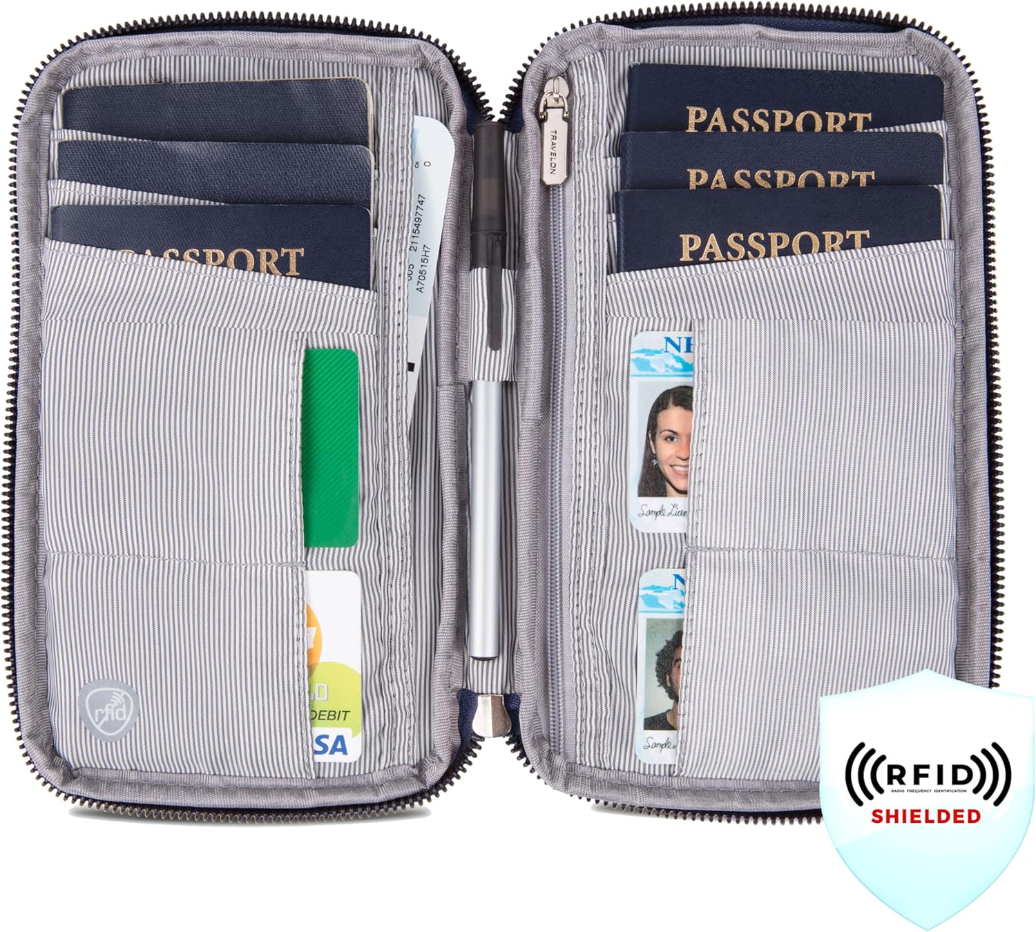 MULTI-PURPOSE ORGANIZATION is at the heart of this wallet. Thoughtfully designed the keep multiple passports organized and separated all in one compact case. Includes 1 large zippered pocket for currency and coins; 1 large slip pocket for currency, receipts, international license and vaccine card; 4 card slots that can also hold a Global Entry card and License; and 1 pen loop.