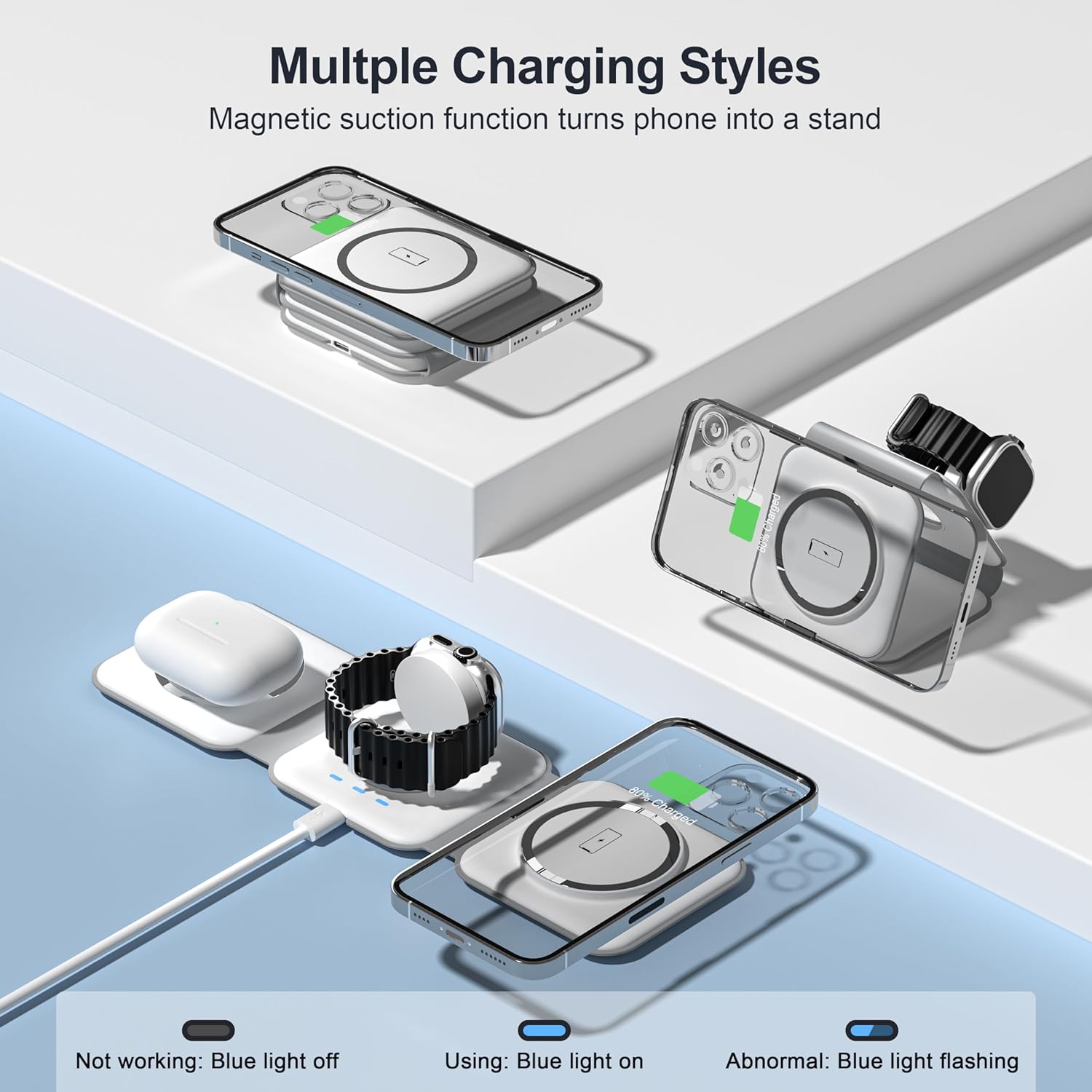 HUNDRED VARIABLE CHARGING METHODS: Using soft silicone to connect the charging pad, the 3 in 1 wireless charging station can instantly transform into a cell phone stand. When charging, the phone can be placed horizontally to watch movies and vertically to video chat. There is a magnetic attraction device on the charging plate, so it will not slip off even if it is shaken. Note: Must be connected to an external power source to use.